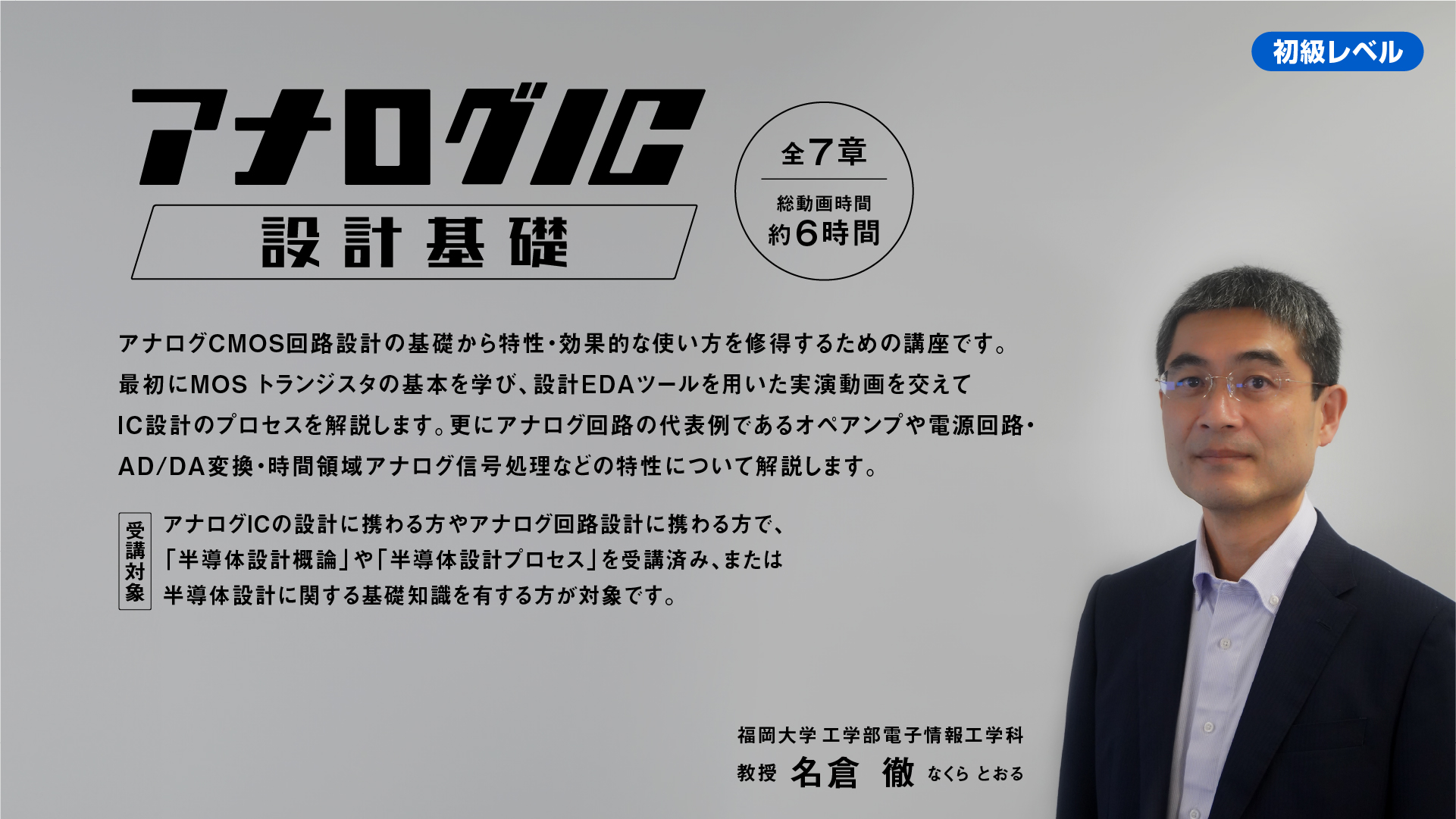 アナログICの設計に携わる方やアナログ回路設計に携わる方で、「半導体設計概論」や「半導体設計プロセス」を受講済み、または半導体設計に関する基礎知識を有する方が対象です。