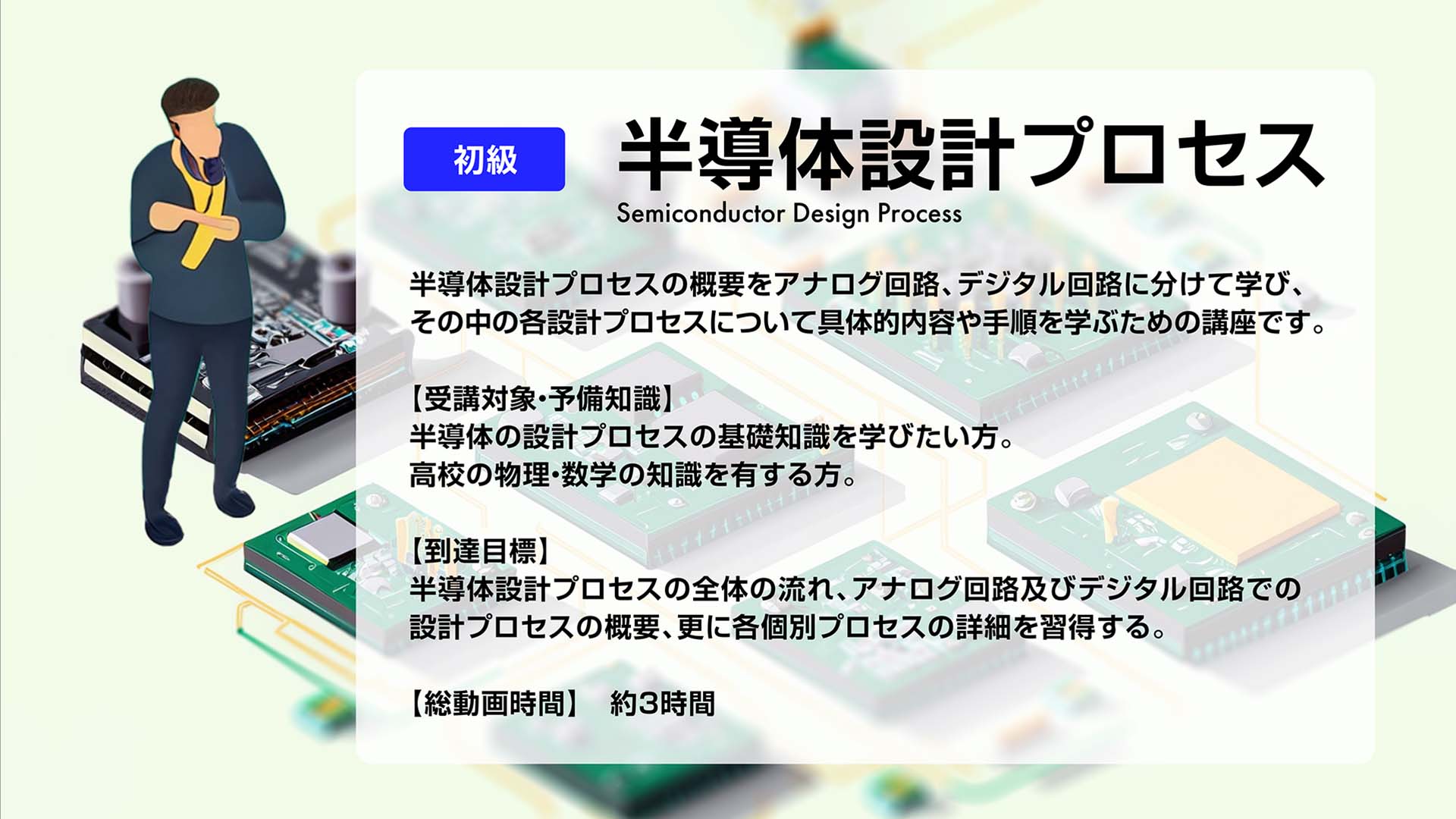 半導体設計プロセスの概要をアナログ回路、デジタル回路に分けて学び、その中の各設計プロセスについて具体的内容や手順を学ぶための講座です。